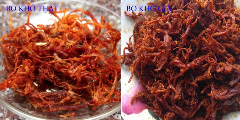 Phân biệt bằng thị giác: khô bò thật sẽ có màu vàng sẫm, sợi dài, to,…Khô bò giả thường sẽ có màu đỏ vừa đến đỏ thẫm vì chúng được tẩm hóa chất và phẩm màu, khô bò giả thường thì sợi ngắn, nhỏ vì chúng được ép lại để nhìn giống bò thật.